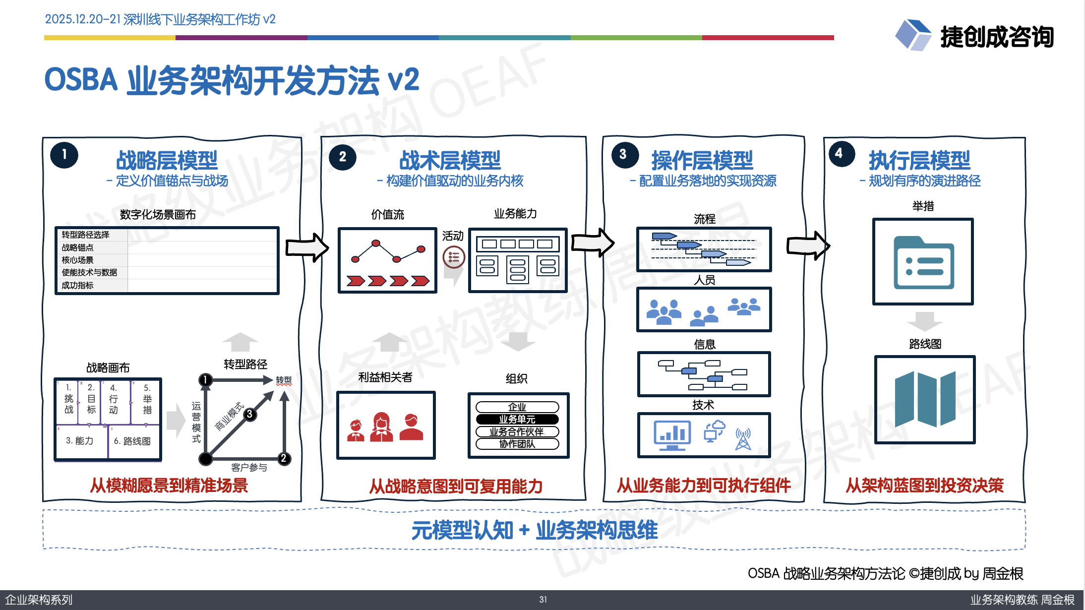 OSBA业务架构开发方法v2,是一套经过国内多家企业实践验证的完整框架。我们通过案例贯穿教学,带您亲身体验从战略到执行的完整架构设计过程。