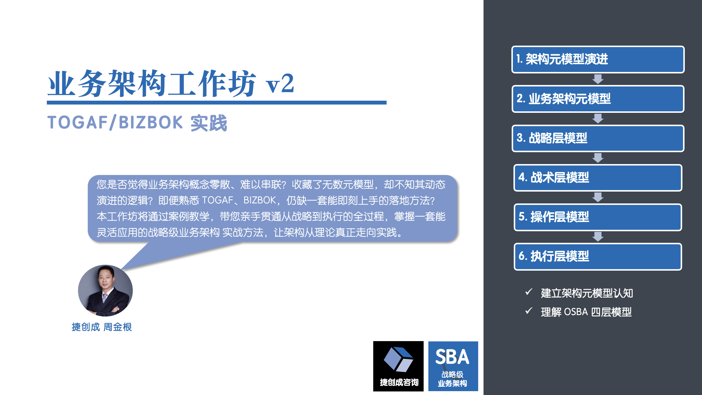 | 1.4 OSBA 业务架构元模型 | 讲解:遵循并实现《企业架构元模型演进2.0》中总结的六大核心原则 |